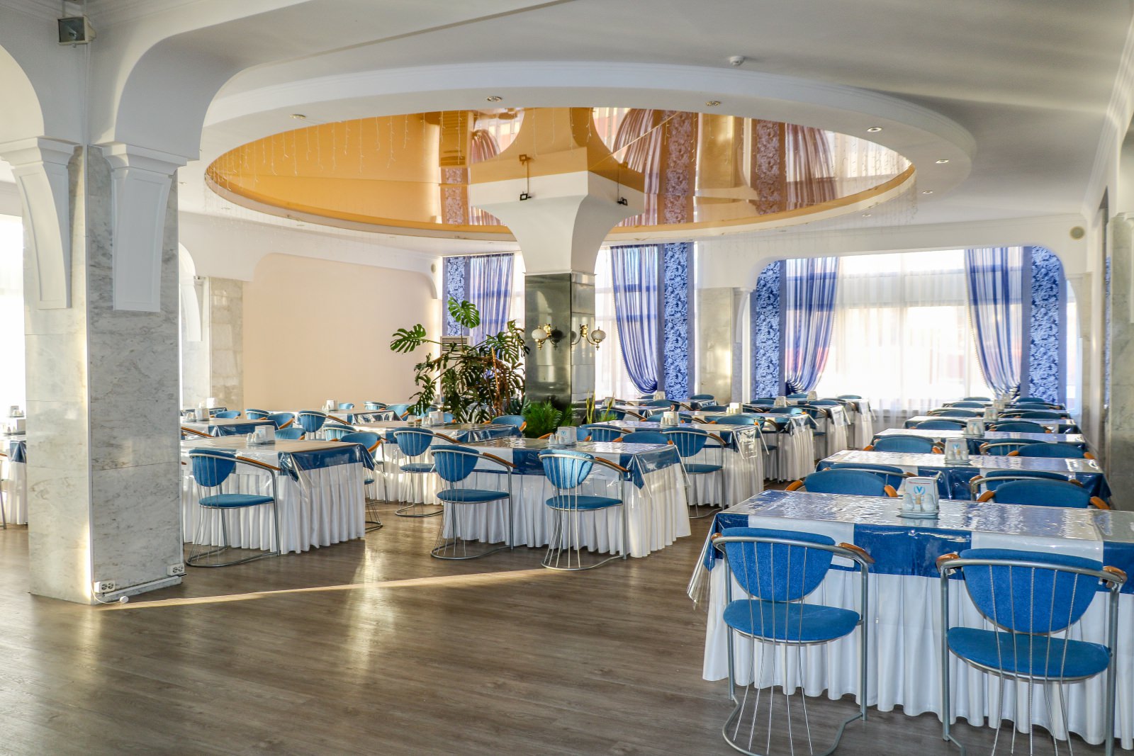 В пансионате есть обеденный зал «Сапфир». Здесь кушают гости, которые остановились в номерах Люкс, Студия и Апартаменты. Зал имеет красивый интерьер синего цвета.